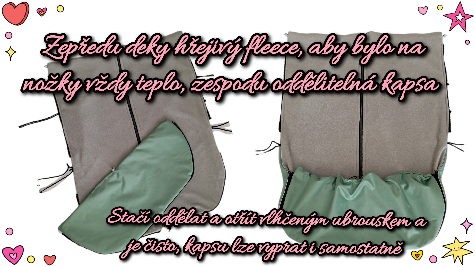 PŘIDĚLÁNÍ DEKY NA ZIPY - deka má po stranách zipy, kterými se přidělává přímo k podložce do kočárku. Je tedy ideální stav mít k ní i naši podložku se zipem. Dále má i přidané tkanice po stranách pro použití samostatně. Dole má našitou omyvatelnou kapsu na nožky.