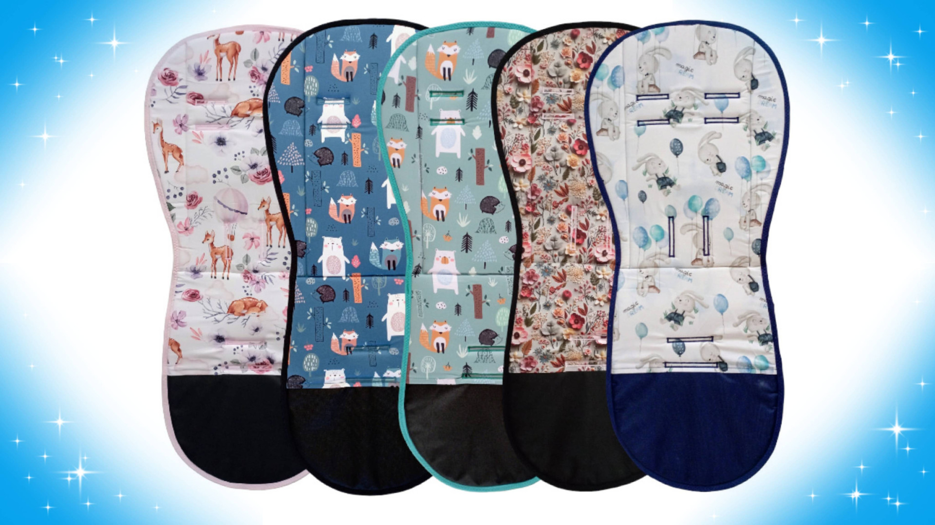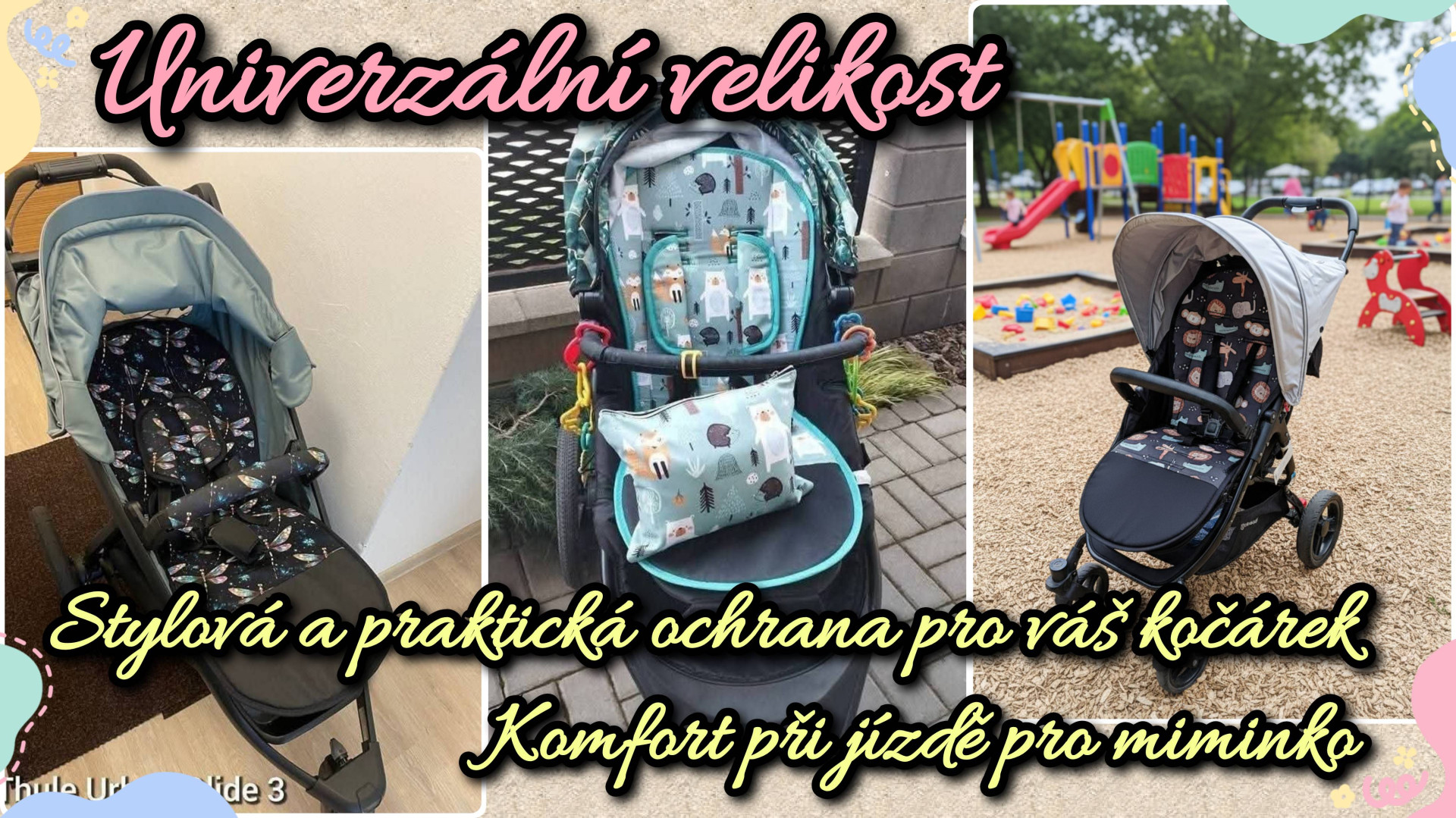 Podložky mají univerzální velikost vhodnou do většiny kočárků na trhu. Pasují například do kočárků Thule, TFK, Valco, Britax, Joie, Petite Mars, X-Lander, Cybex, Bugaboo, Lionelo, Hauck, Kinderkraft, Joolz, Baby Jogger a do spousty dalších.