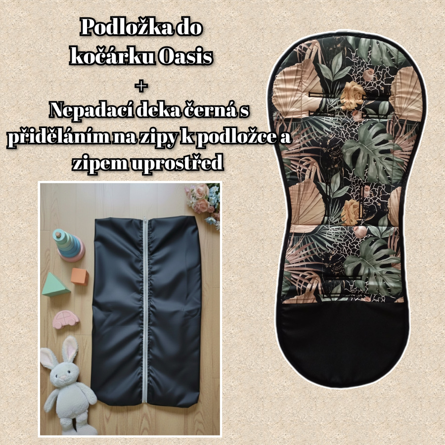 Podložka strana s potiskem bavlněná, druhá strana černá bavlna (podrobné informace a rozměry najdete v sekci podložky do kočárku)